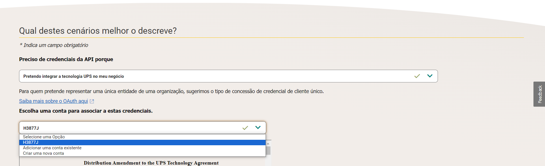 2. Selecciona “Quiero integrar la tecnología de UPS con mi actividad comercial” en el primer campo y seleccione tu número de cuenta en el segundo campo. 3. Marca la casilla “Acepto el acuerdo modificado de la API de UPS” después de desplazarte hasta el final del documento y, por último, haz clic en “Siguiente”.